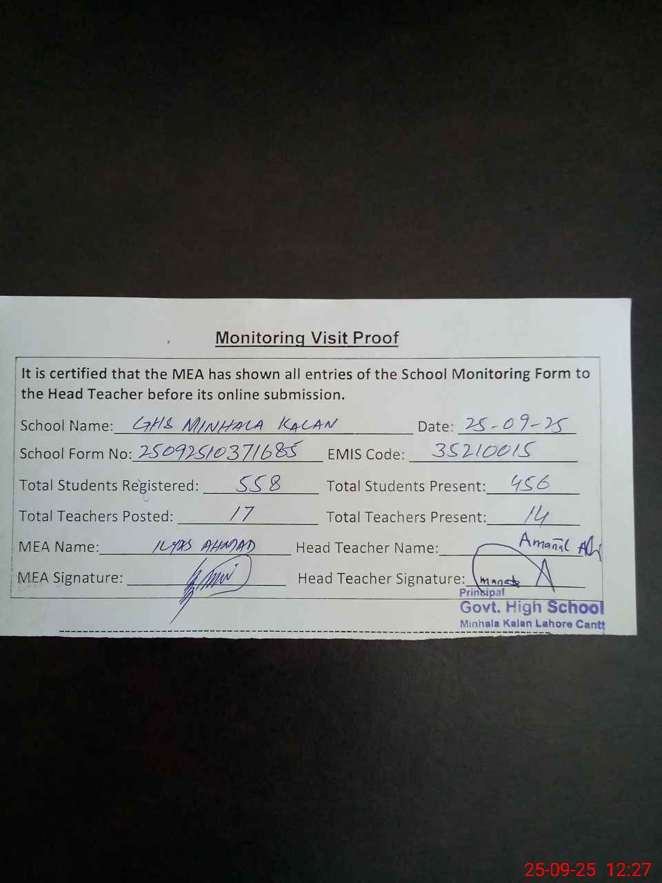 | Attendance Register | Head Teacher | MEA with School | Visit Proof |