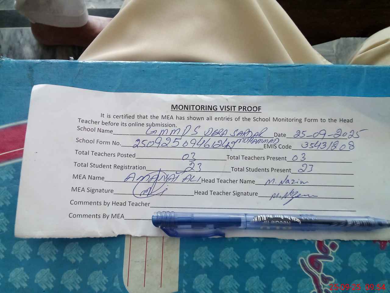 | Attendance Register | Head Teacher | MEA with School | Visit Proof |