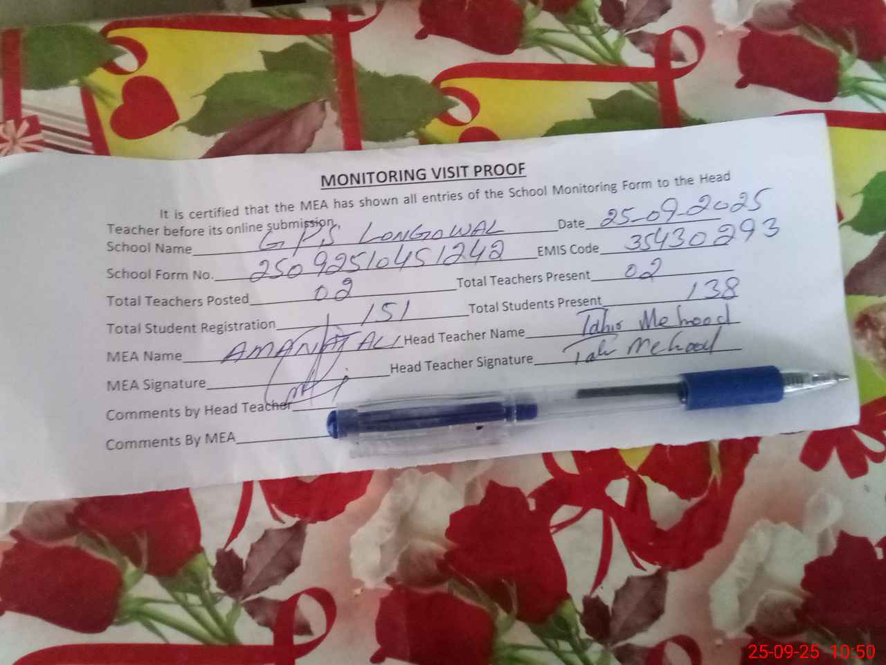| Attendance Register | Head Teacher | MEA with School | Visit Proof |