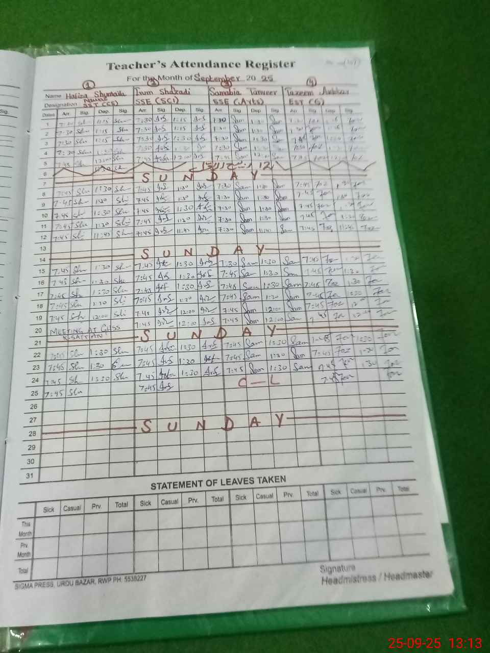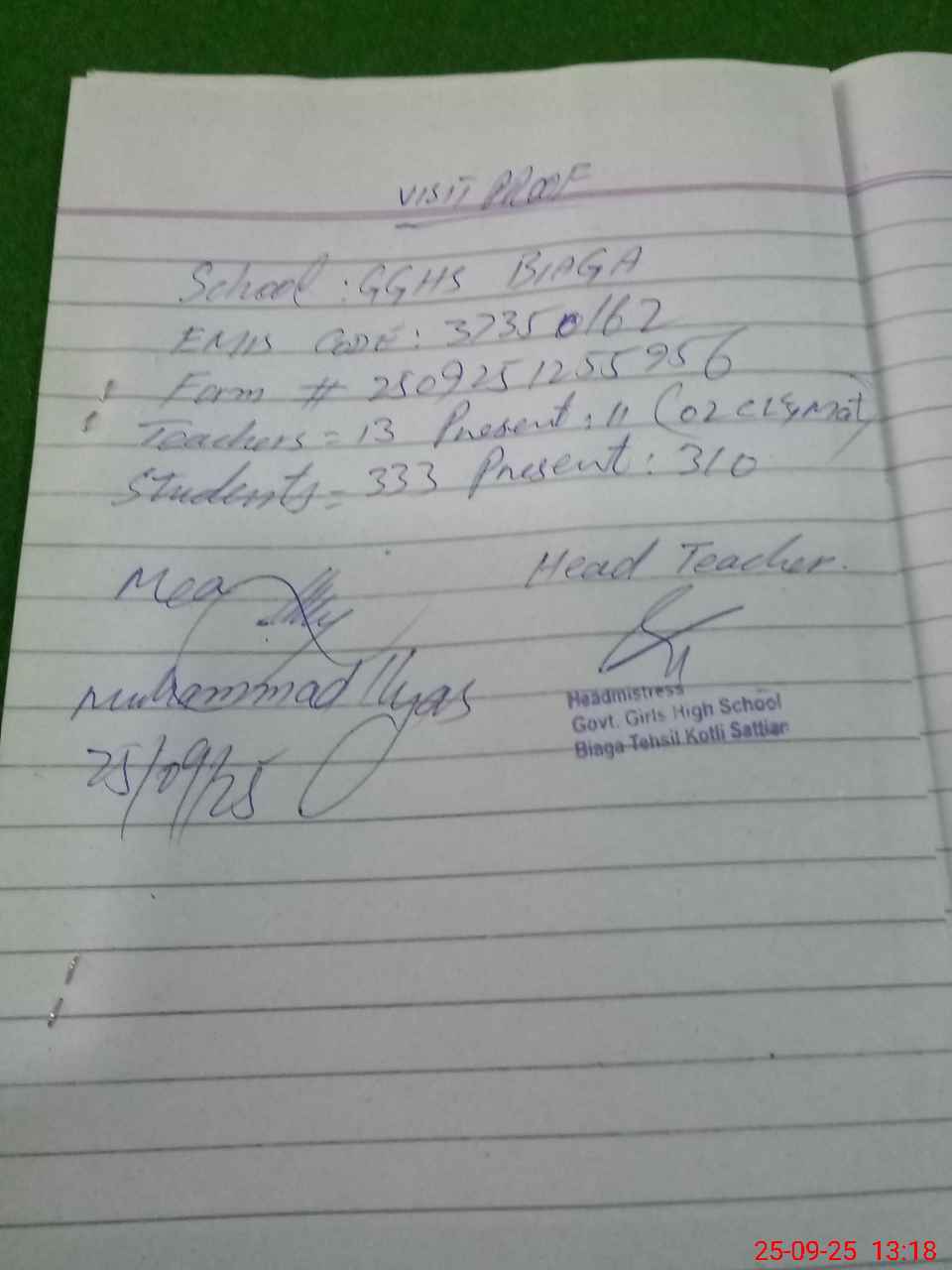 | Attendance Register | Head Teacher | MEA with School | Visit Proof |