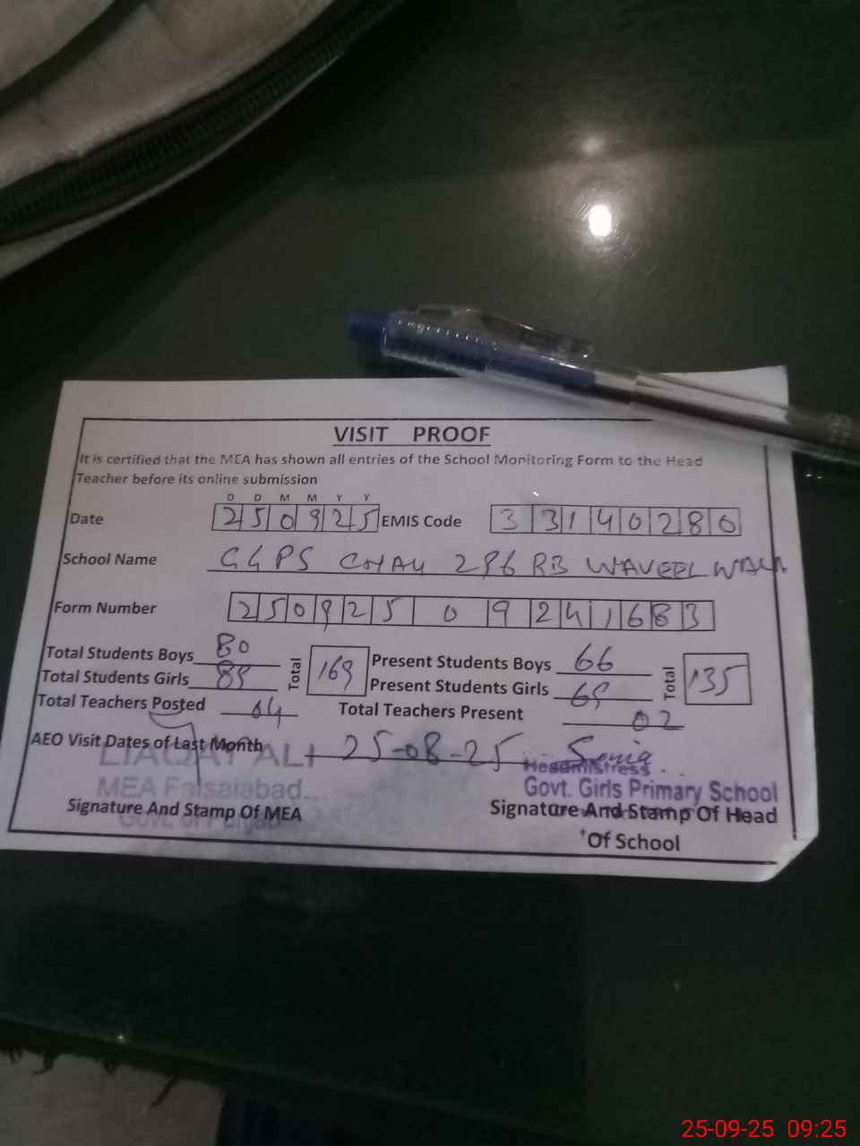 | Attendance Register | Head Teacher | MEA with School | Visit Proof |