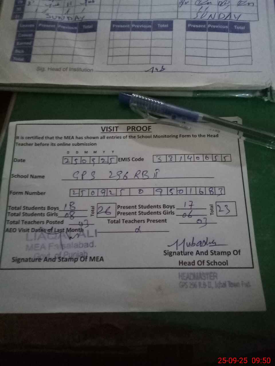 | Attendance Register | Head Teacher | MEA with School | Visit Proof |
