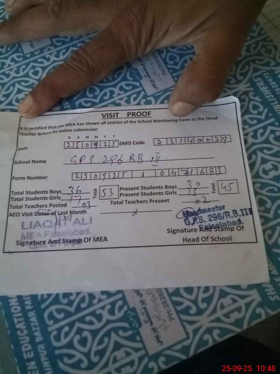 | Attendance Register | Head Teacher | MEA with School | Visit Proof |