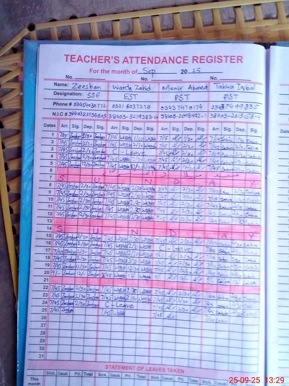 | CNIC | Full Name | Designation | R/C | Absence During Last Calender Month |