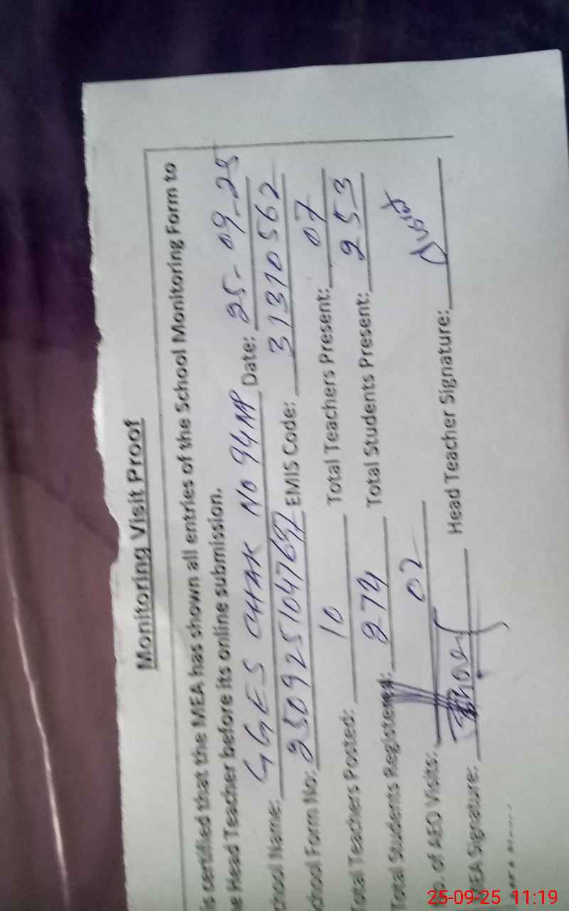 | Attendance Register | Head Teacher | MEA with School | Visit Proof |