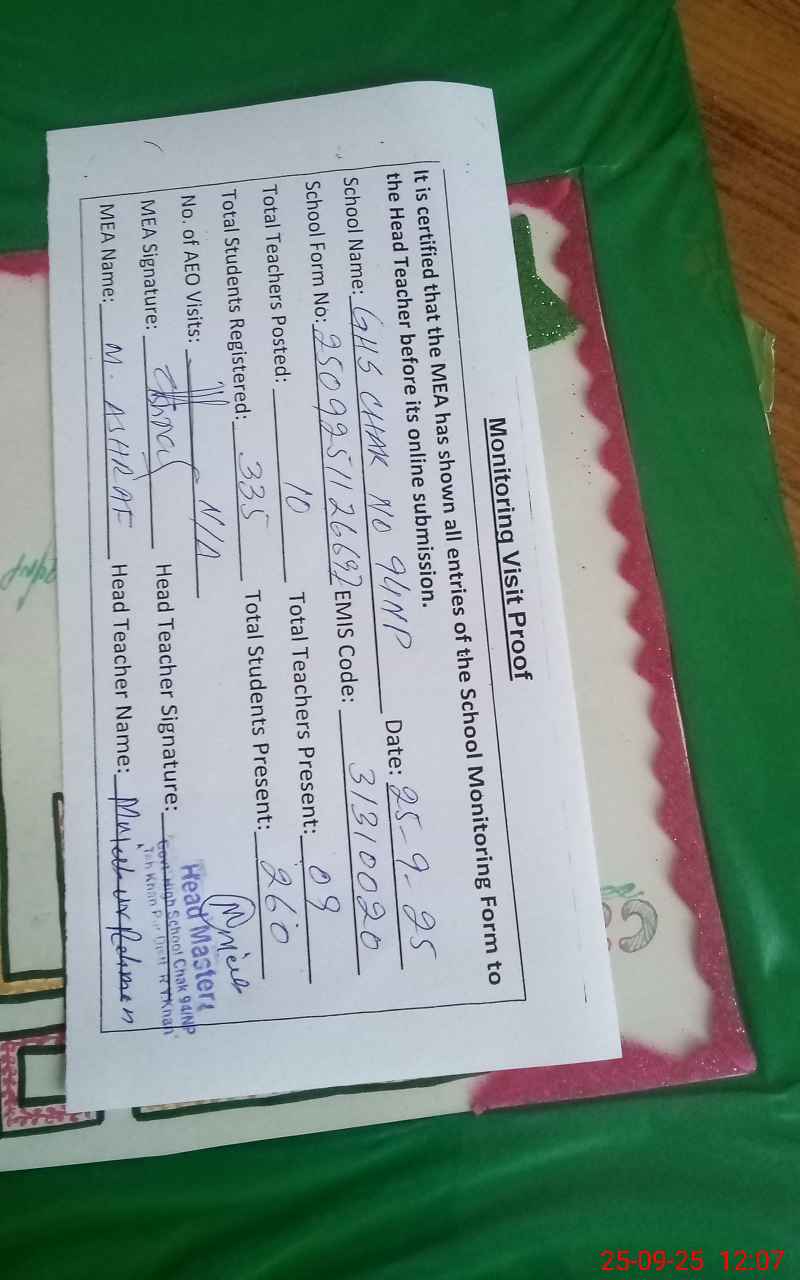 | EMIS Code: 31310020 | Name of School: GHS CHAK NO 94 NP | |||