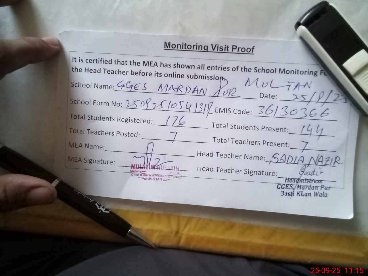 | Attendance Register | Head Teacher | MEA with School | Visit Proof |