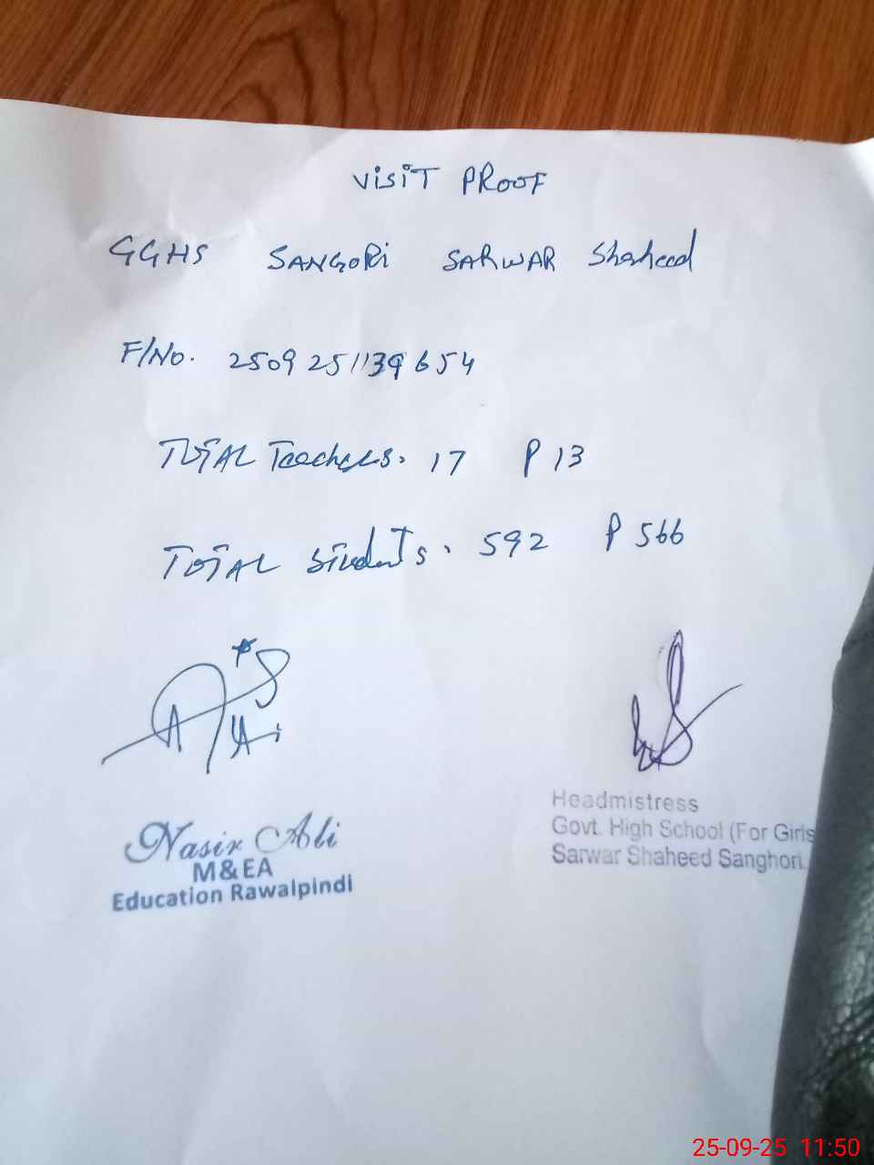 | Attendance Register | Head Teacher | MEA with School | Visit Proof |