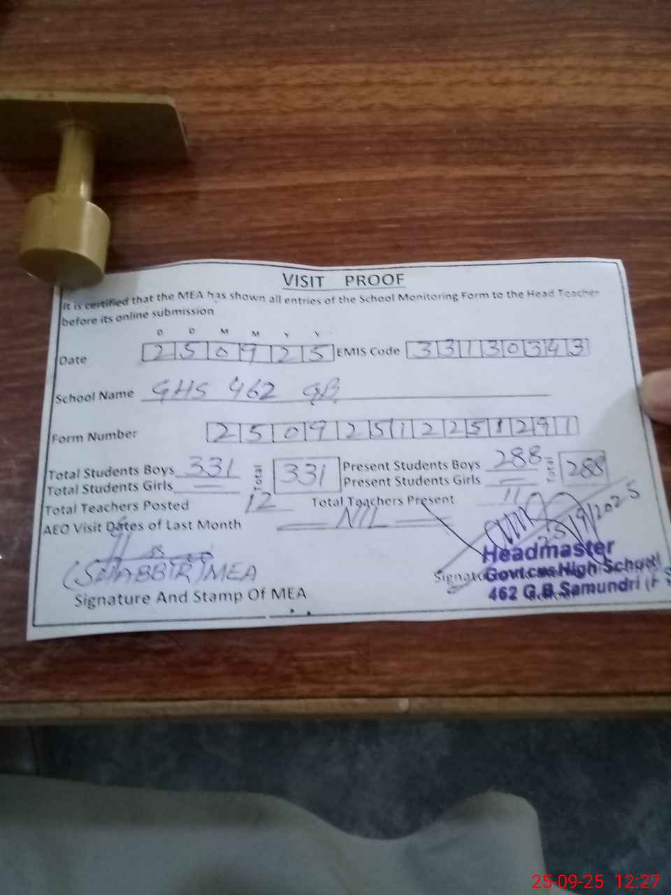 | Attendance Register | Head Teacher | MEA with School | Visit Proof |