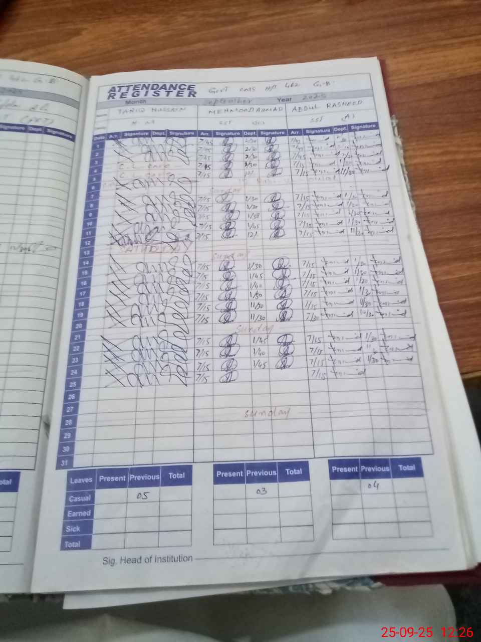 | CNIC | Full Name | Designation | R/C | Absence during last cal. month |