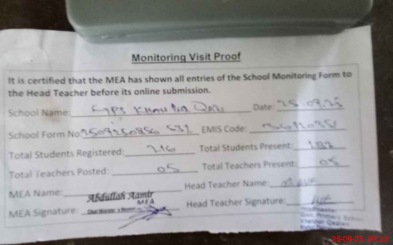 | Attendance Register | Head Teacher | MEA with School | Visit Proof |