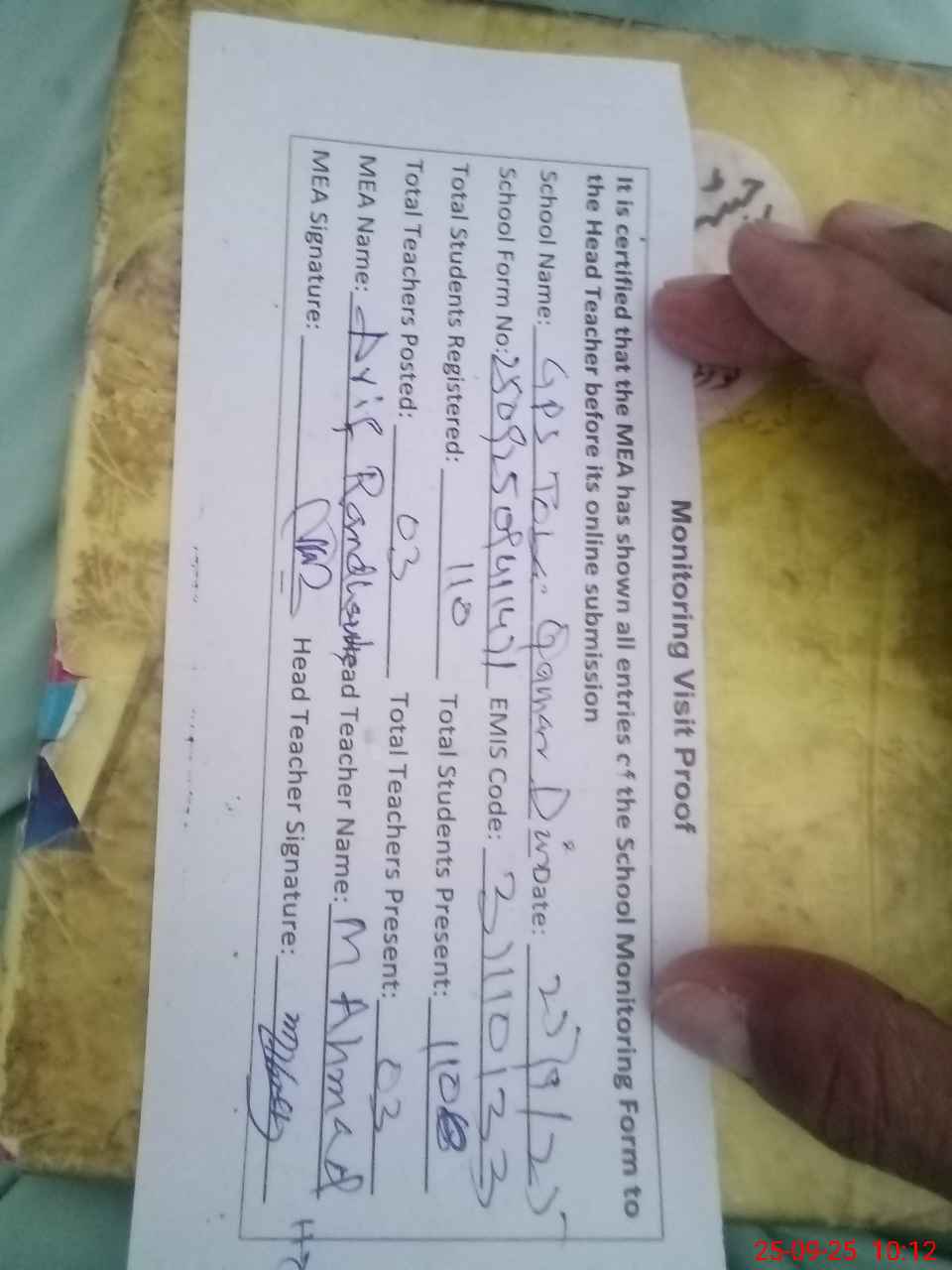 | EMIS Code: 31110133 | Name of School: GPS TOBA QUMMAR DIN | |||