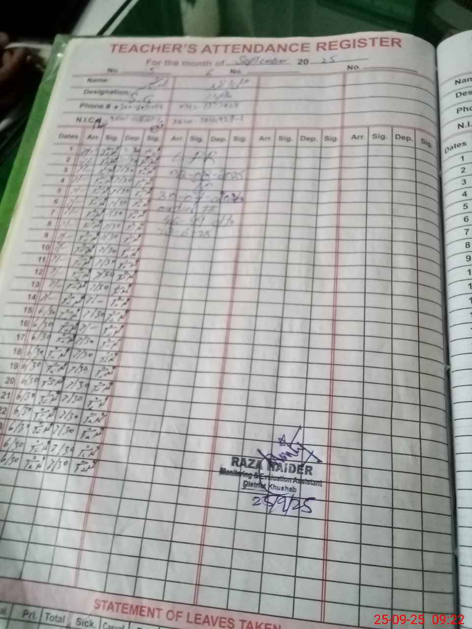 | CNIC | Full Name | Designation | R/C | Absence during last cal. month |