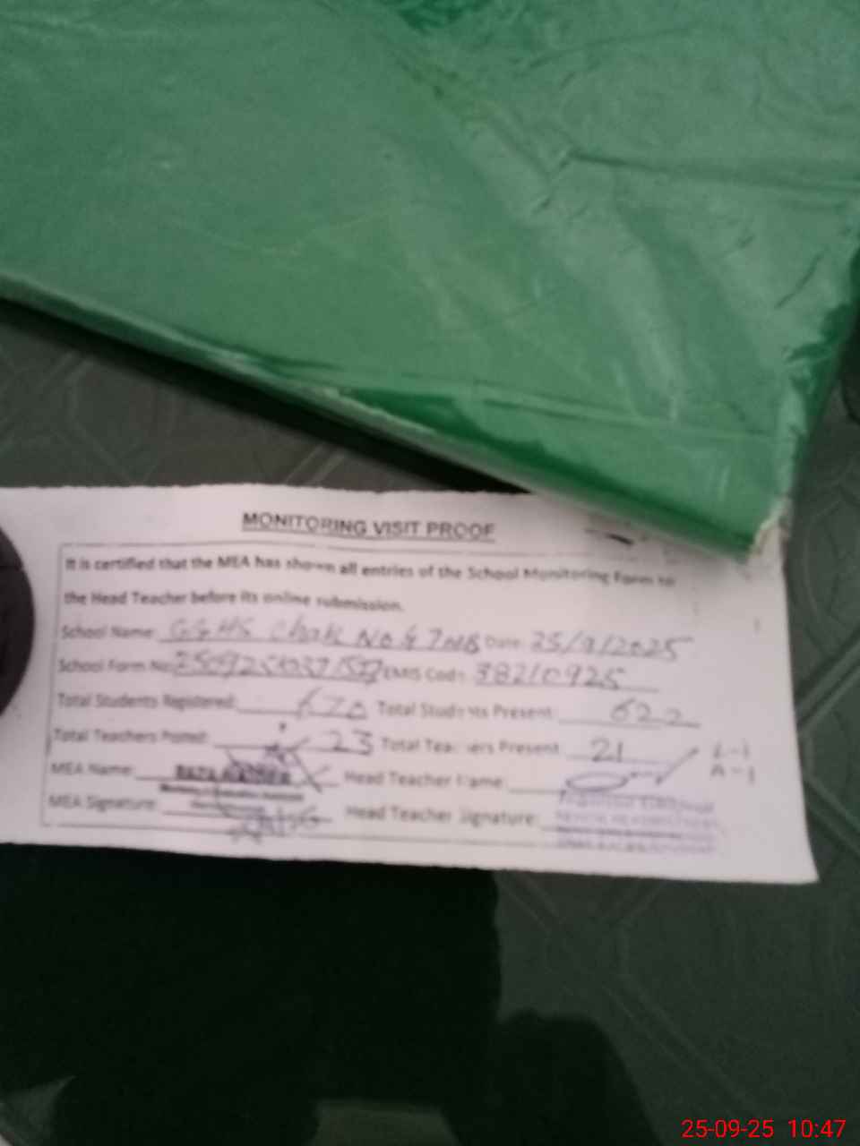 | Attendance Register | Head Teacher | MEA with School | Visit Proof |
