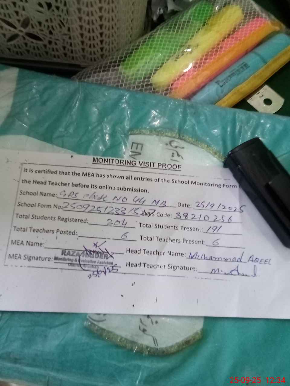 | Attendance Register | Head Teacher | MEA with School | Visit Proof |