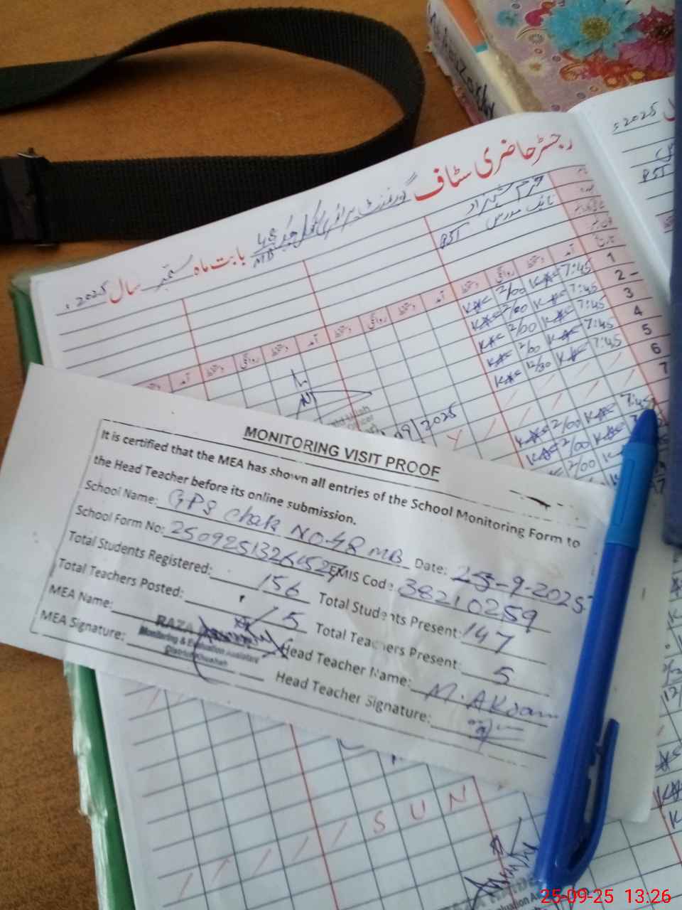 | Attendance Register | Head Teacher | MEA with School | Visit Proof |