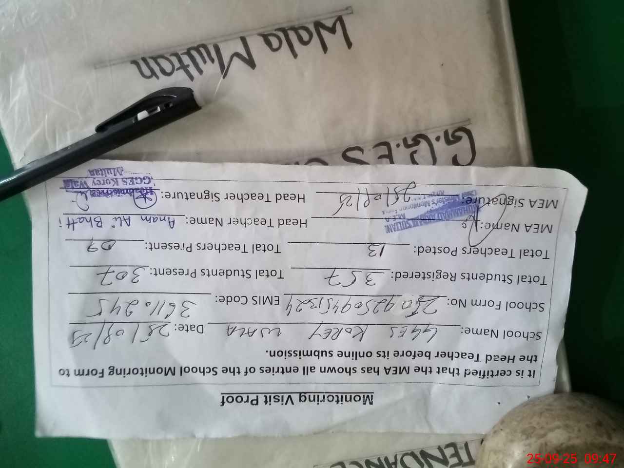 | Attendance Register | Head Teacher | MEA with School | Visit Proof |