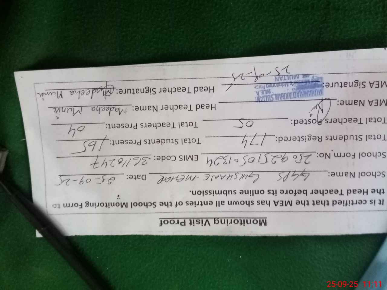 | Monitoring Date: 25-09-2025 | Start Time: 25-09-2025 10:36 AM | End Time: 25-09-2025 11:11 AM | Name of MEA: MU**** AK**** | |