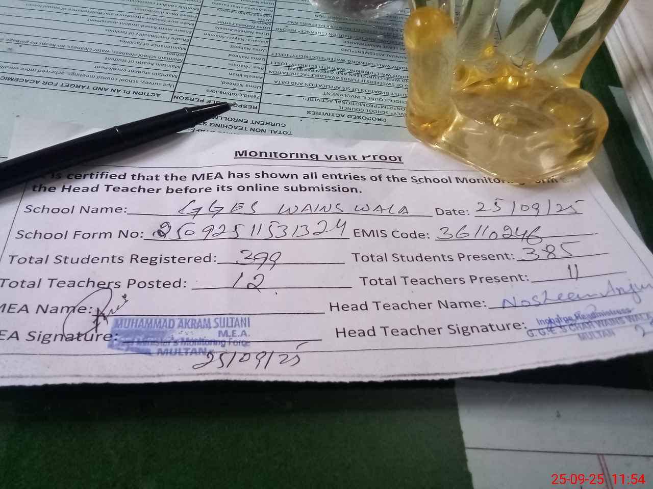 | Attendance Register | Head Teacher | MEA with School | Visit Proof |