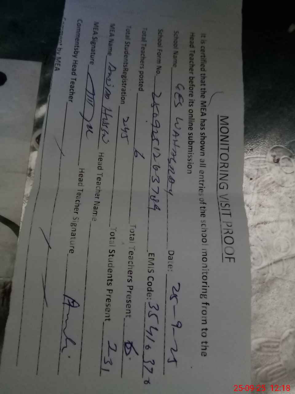| Attendance Register | Head Teacher | MEA with School | Visit Proof |
