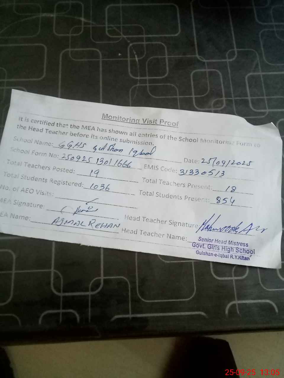 | EMIS Code: 31330513 | Name of School: GGHS GULSHAN IQBAL | |||
