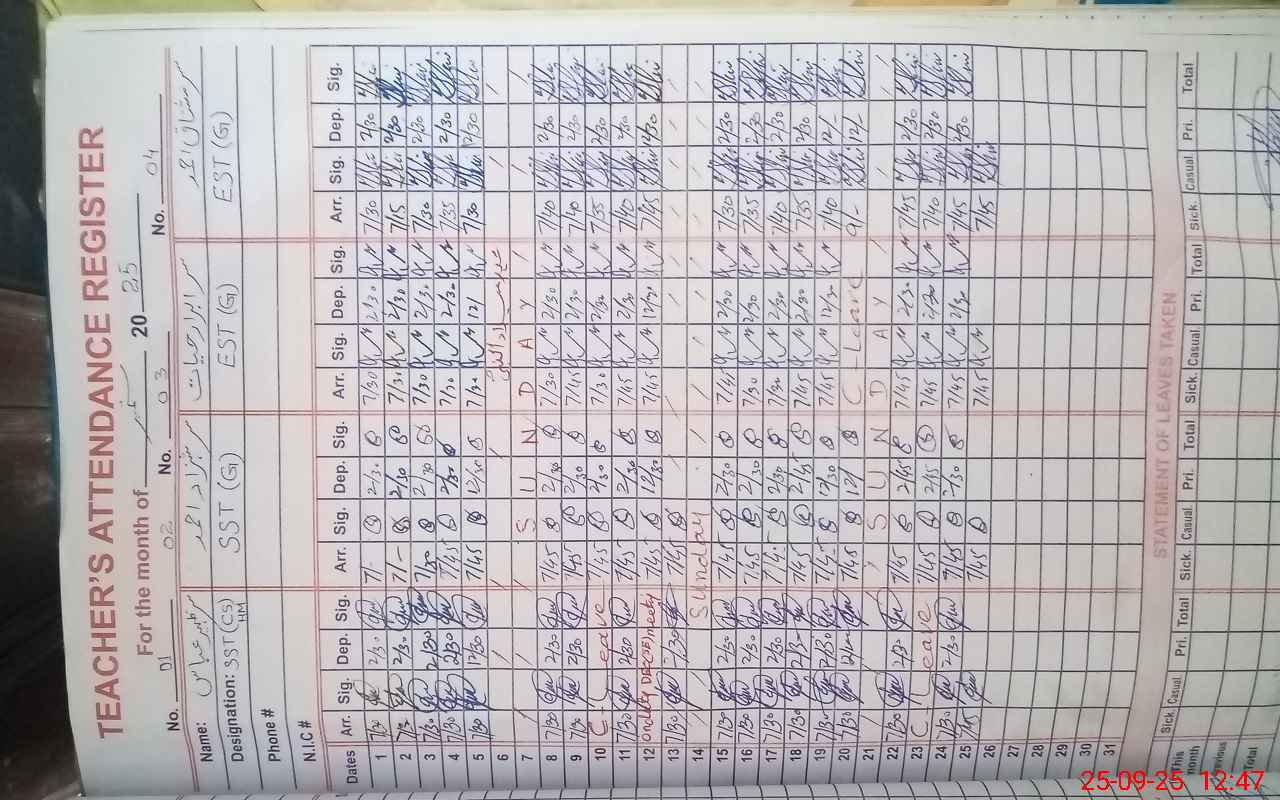 | CNIC | Full Name | Designation | R/C | Absence During Last Calender Month |