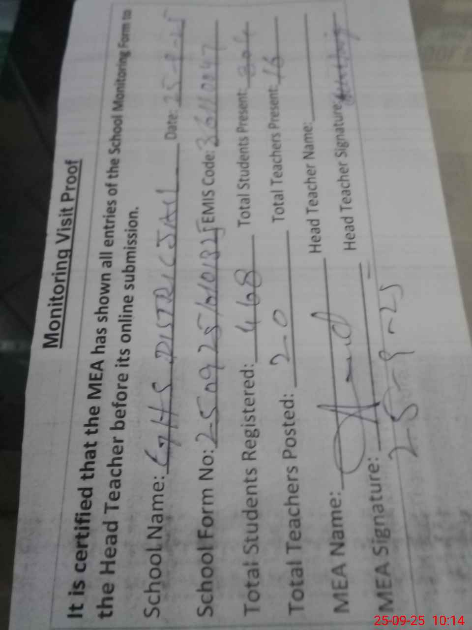 | Attendance Register | Head Teacher | MEA with School | Visit Proof |