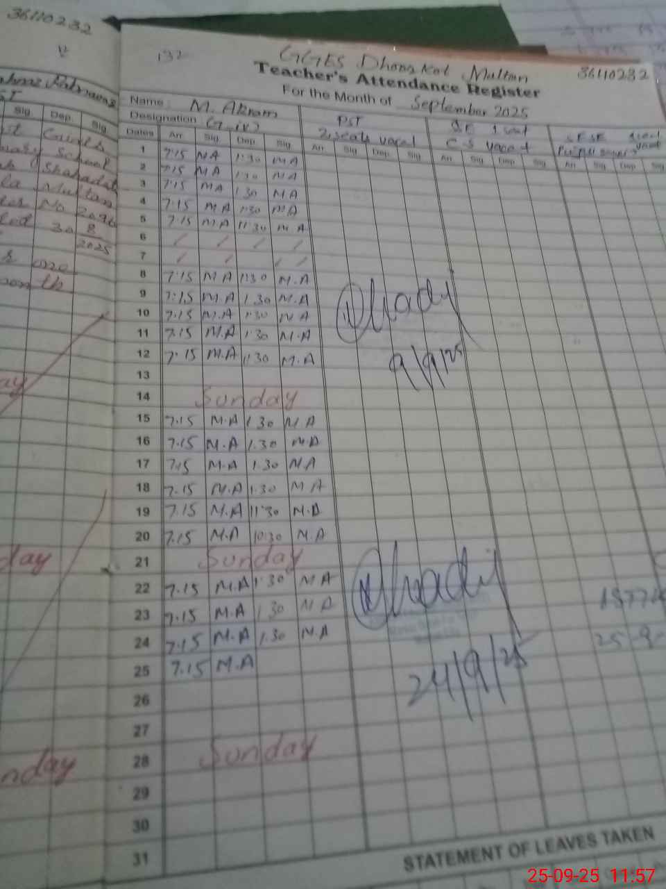 | CNIC | Full Name | Designation | R/C | Absence During Last Calender Month |