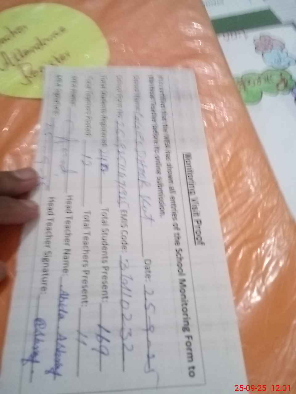 | Attendance Register | Head Teacher | MEA with School | Visit Proof |