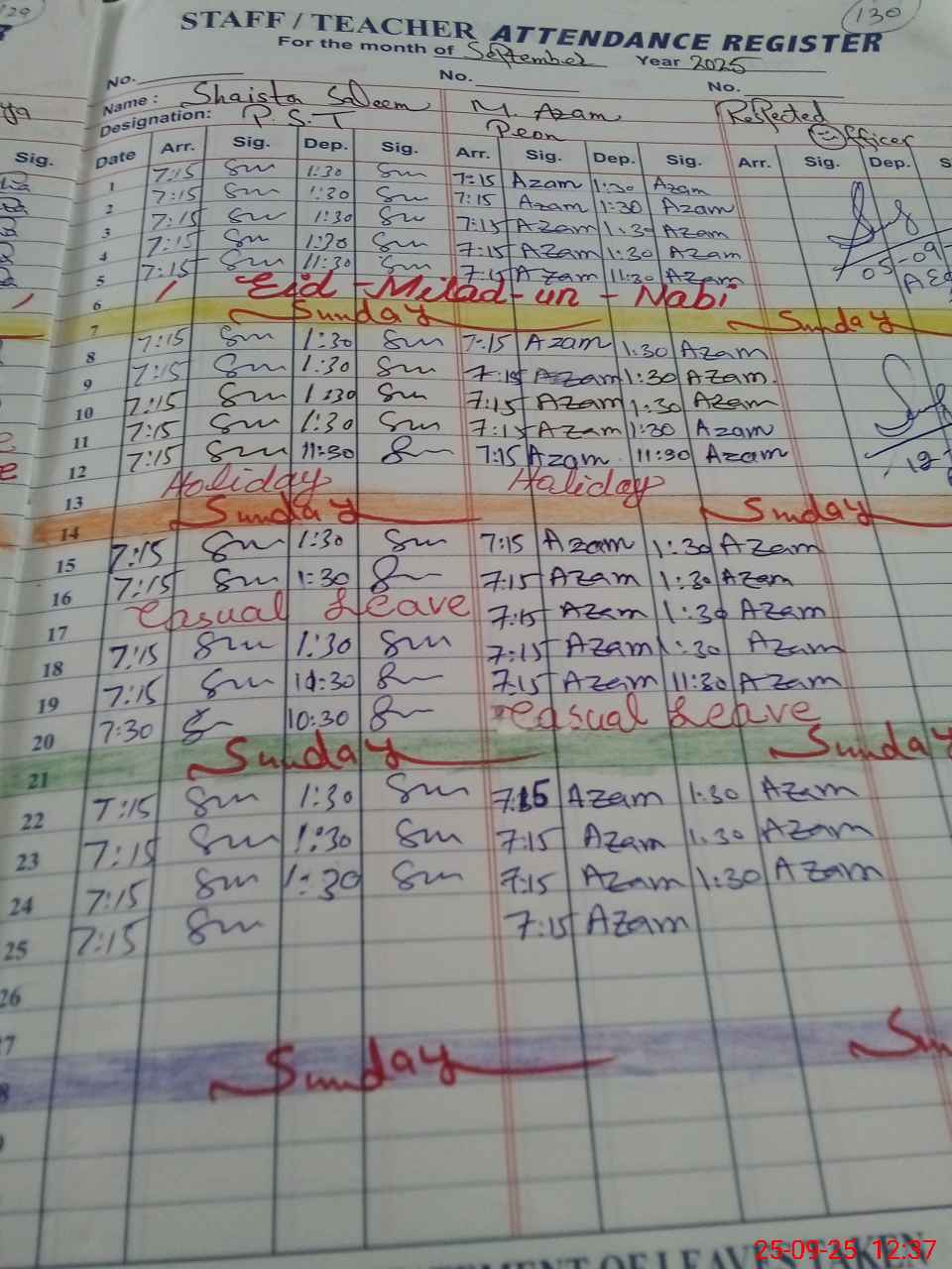 | CNIC | Full Name | Designation | R/C | Absence During Last Calender Month |