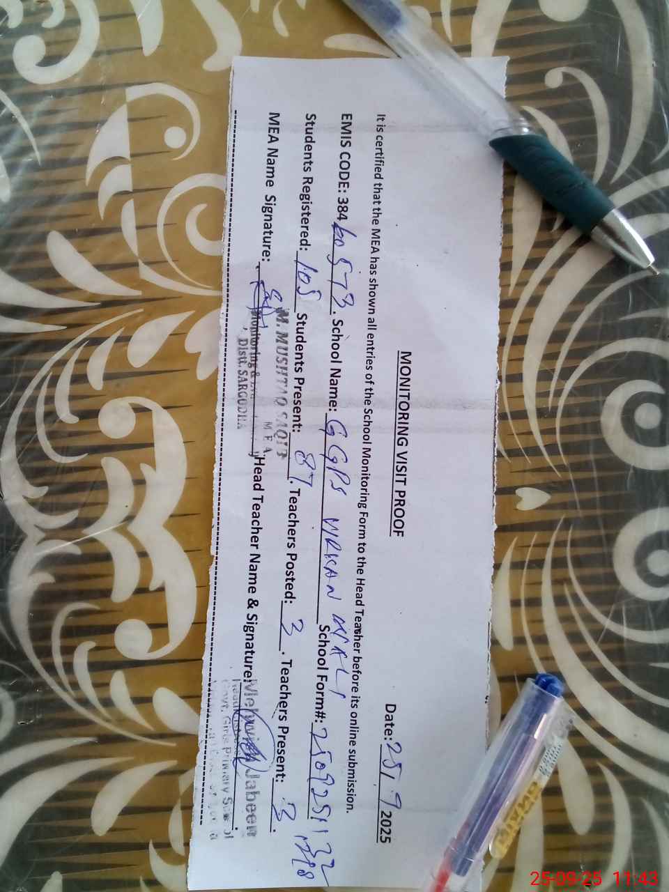 | Attendance Register | Head Teacher | MEA with School | Visit Proof |
