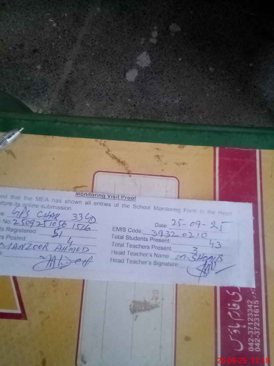 | Attendance Register | Head Teacher | MEA with School | Visit Proof |