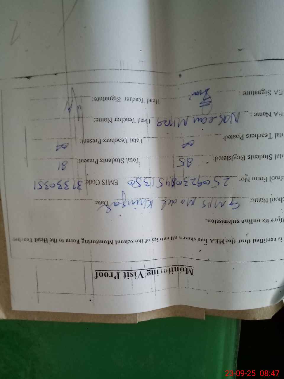 | Attendance Register | Head Teacher | MEA with School | Visit Proof |
