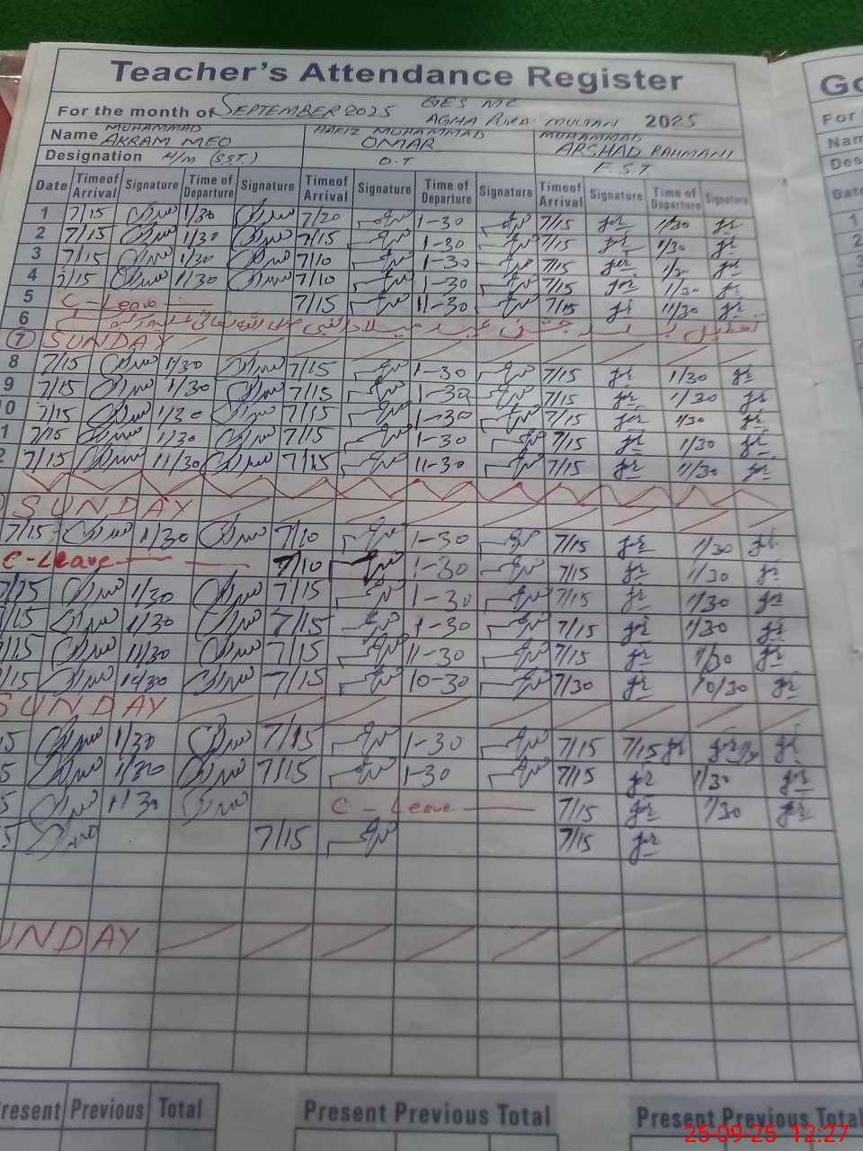 | CNIC | Full Name | Designation | R/C | Absence During Last Calender Month |