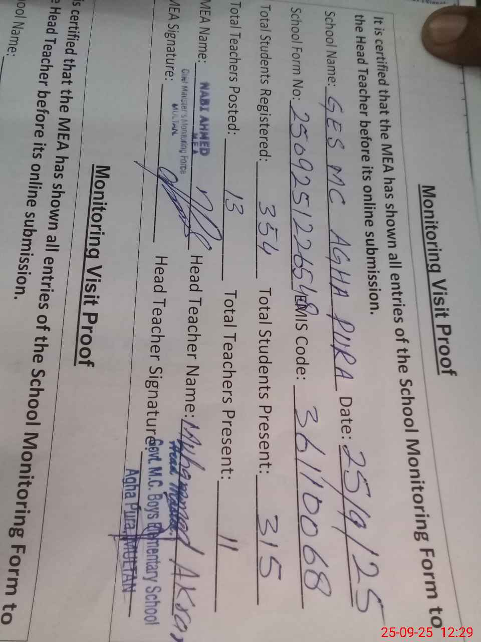 | Attendance Register | Head Teacher | MEA with School | Visit Proof |