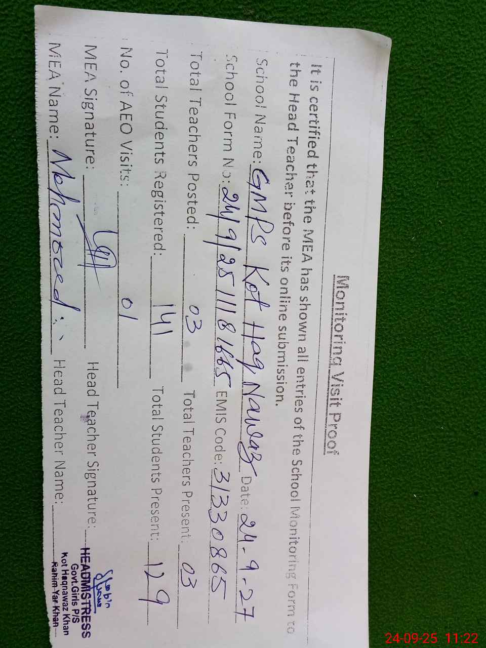 | Attendance Register | Head Teacher | MEA with School | Visit Proof |