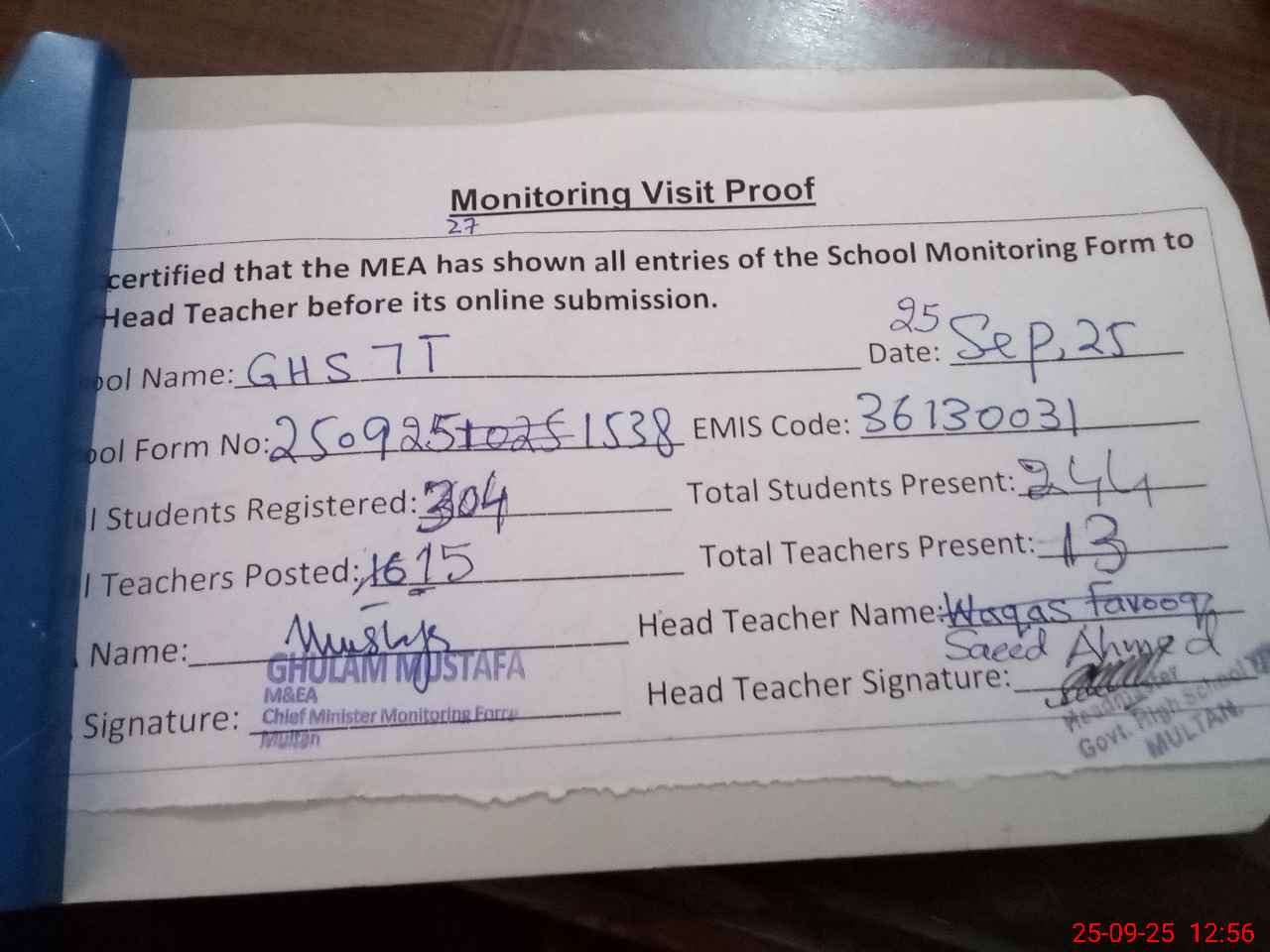 | EMIS Code: 36130031 | Name of School: GHS CHAK 7 T MULTAN | |||