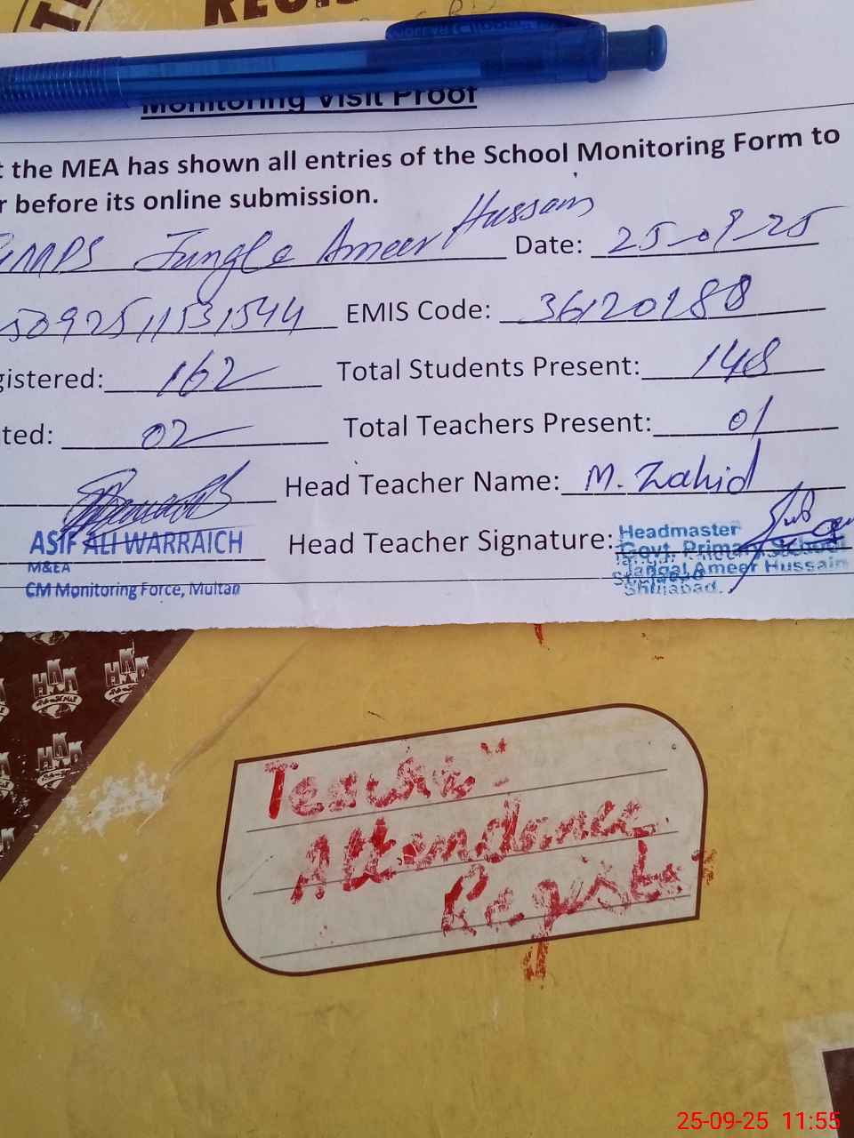 | Attendance Register | Head Teacher | MEA with School | Visit Proof |