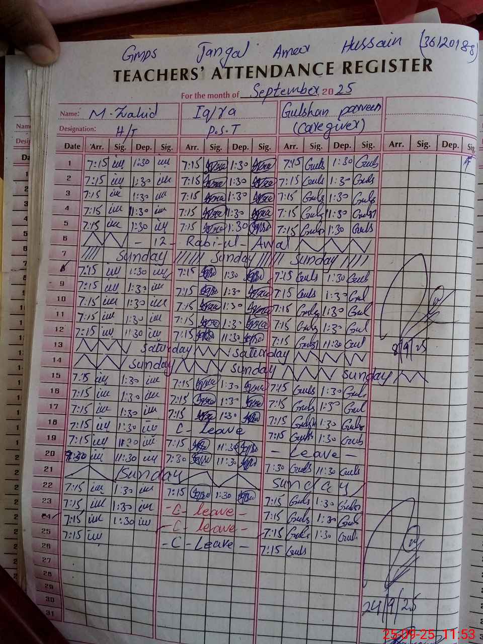 | CNIC | Full Name | Designation | R/C | Absence During Last Calender Month |