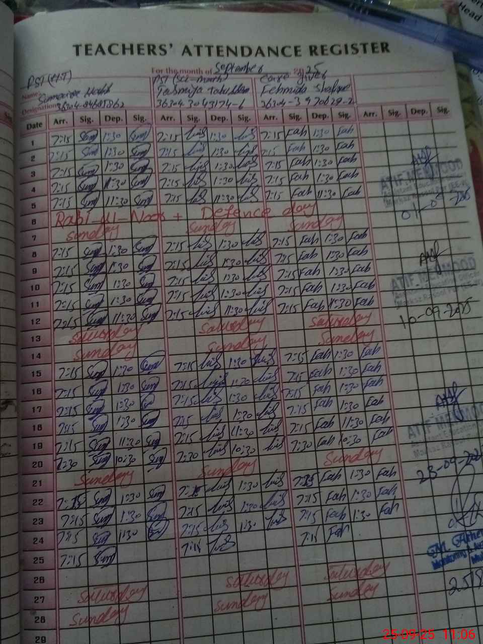 | CNIC | Full Name | Designation | R/C | Absence During Last Calender Month |