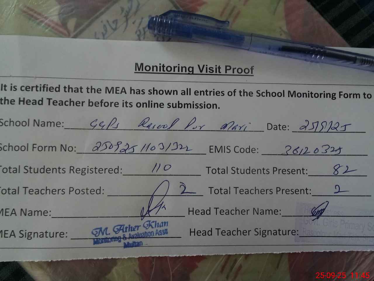 | Attendance Register | Head Teacher | MEA with School | Visit Proof |