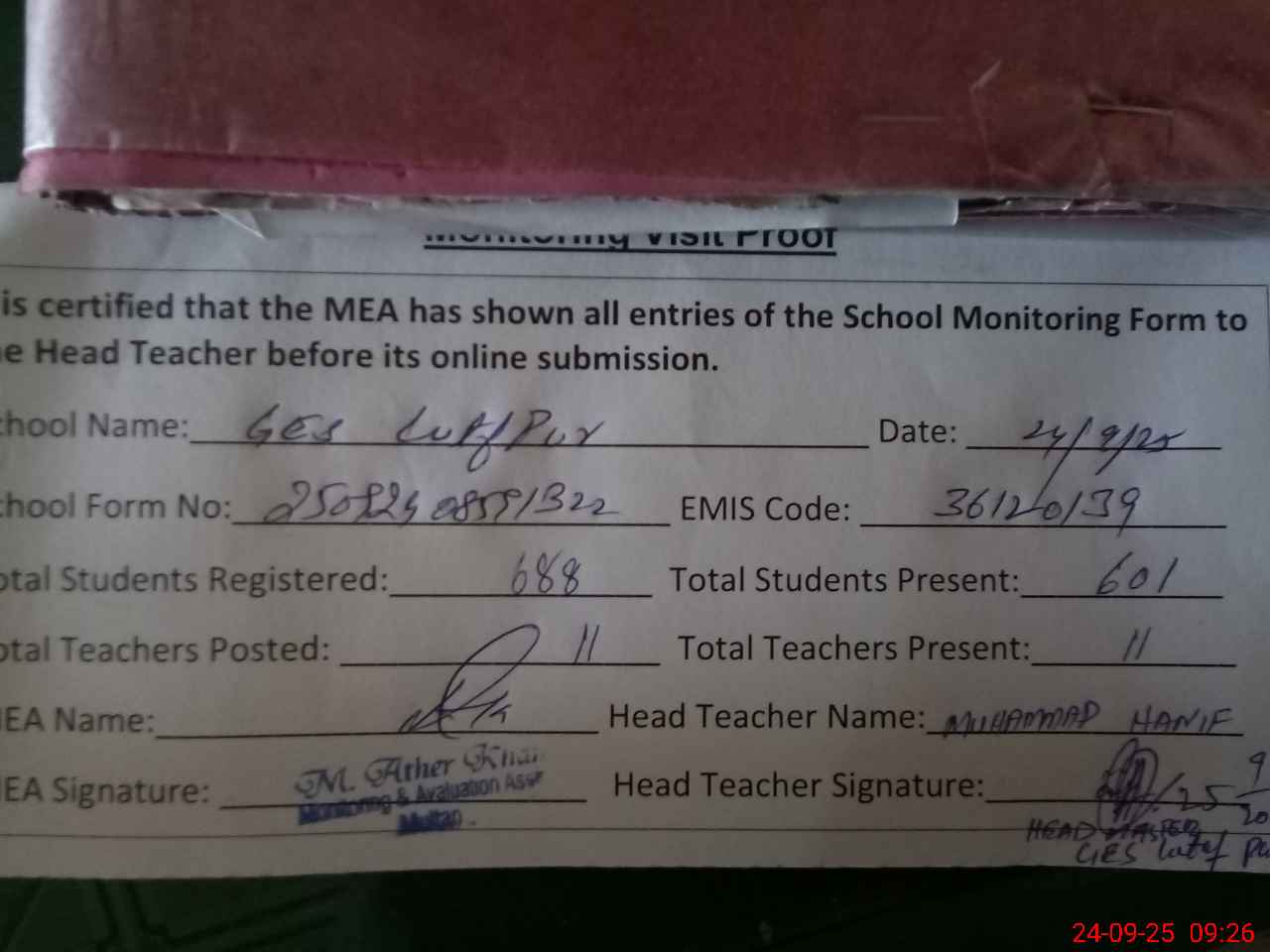 | Attendance Register | Head Teacher | MEA with School | Visit Proof |