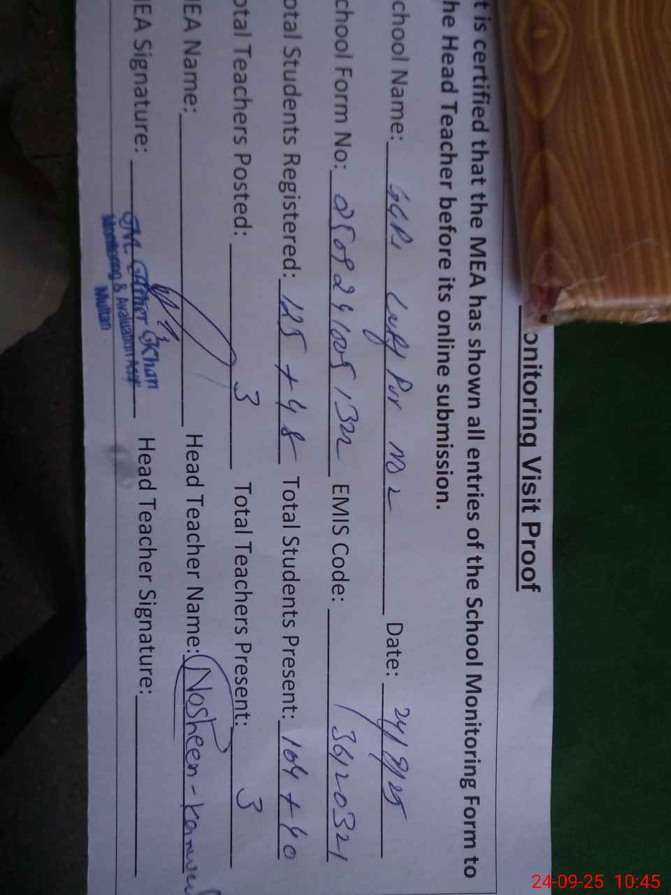 | Attendance Register | Head Teacher | MEA with School | Visit Proof |