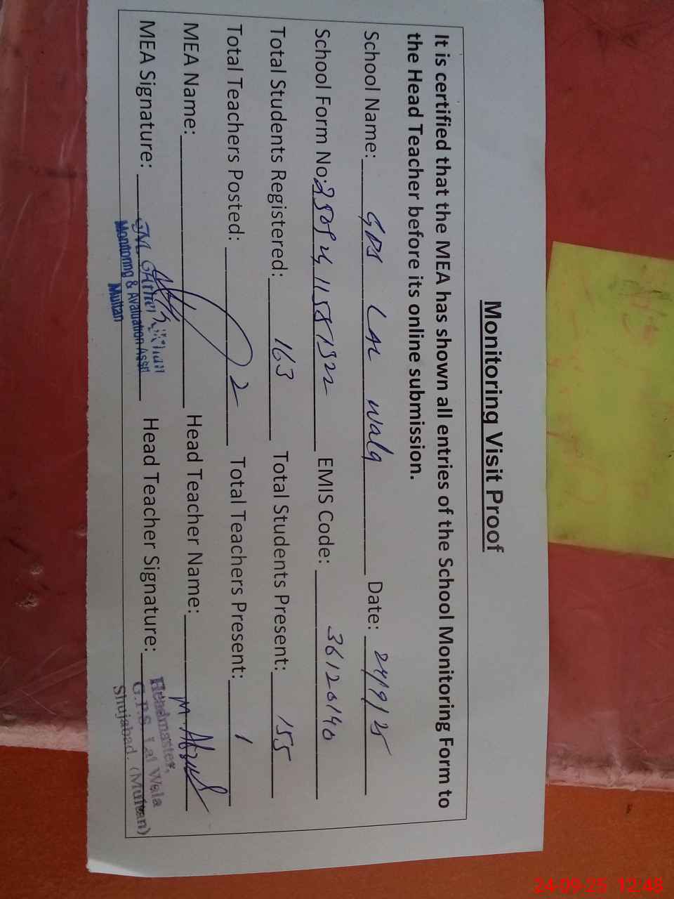 | Attendance Register | Head Teacher | MEA with School | Visit Proof |