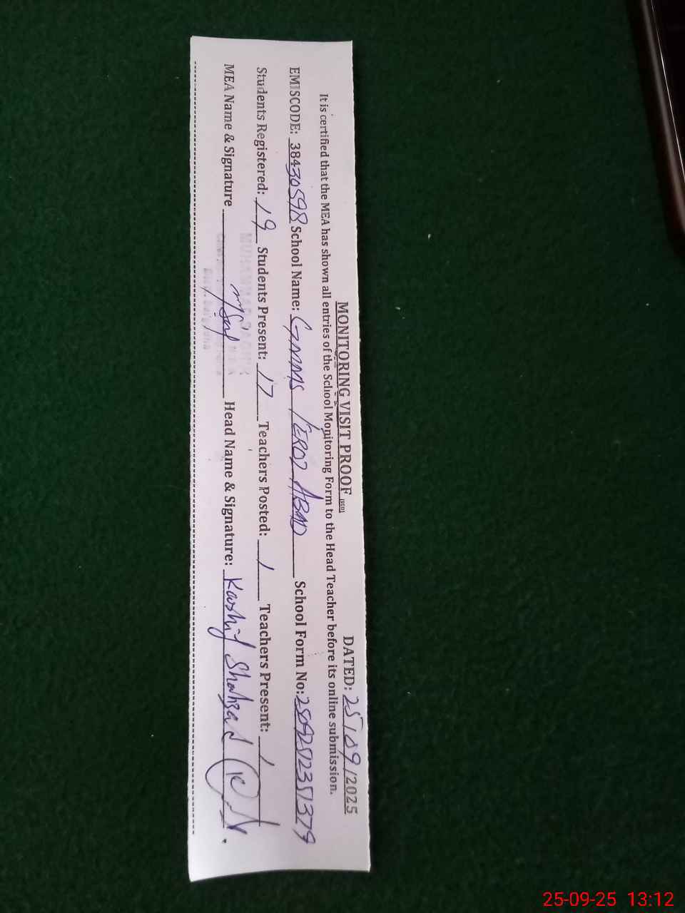| Certified that this School was Inspected by the Undersigned MEA/DMO Today and the Information Stated Above is as Per Record. | |||||