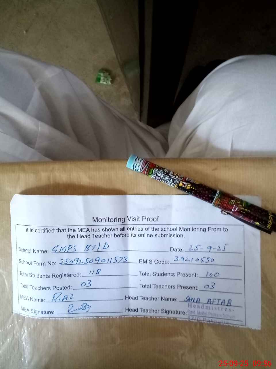 | Attendance Register | Head Teacher | MEA with School | Visit Proof |