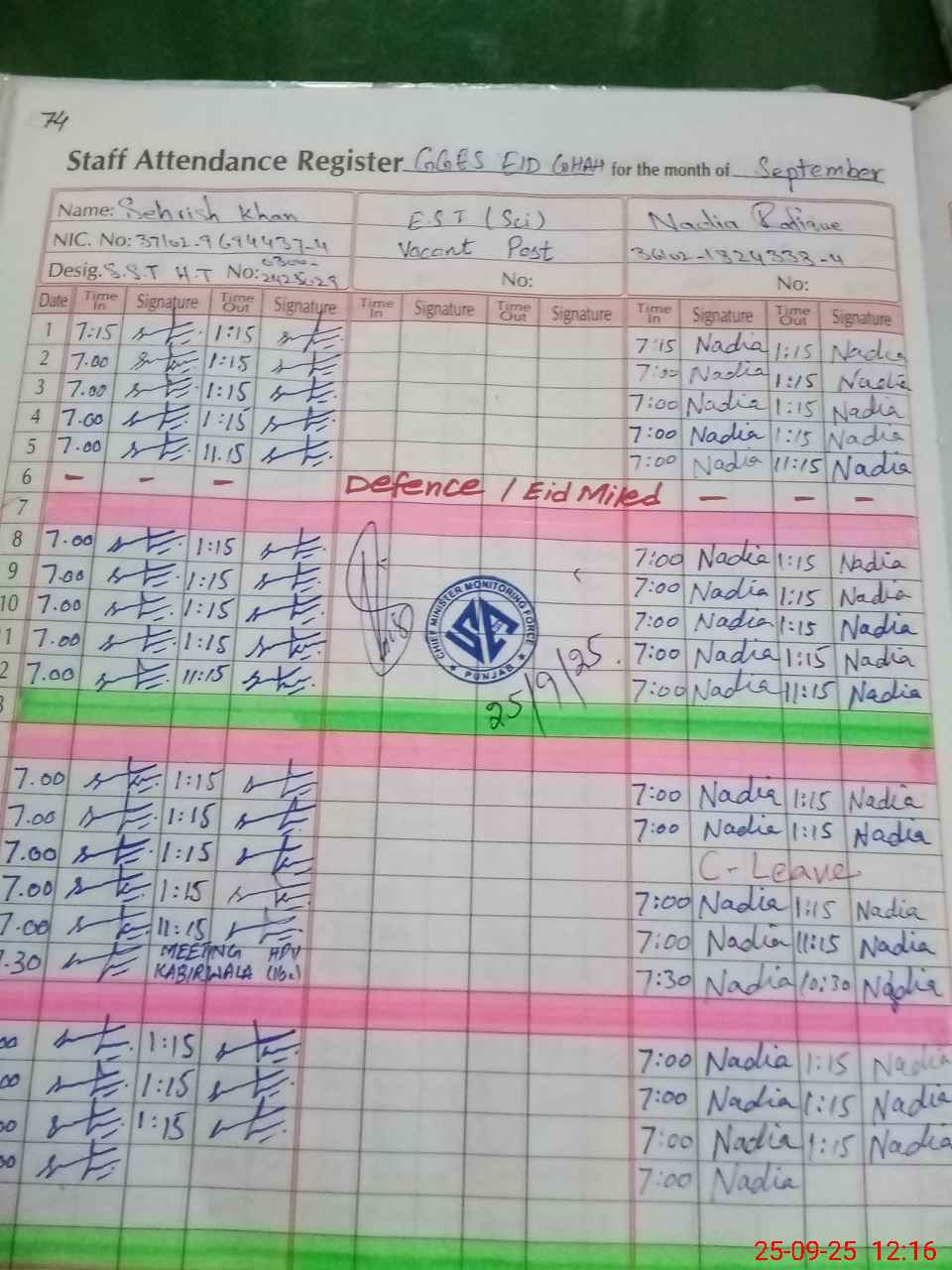 | CNIC | Full Name | Designation | R/C | Absence During Last Calender Month |