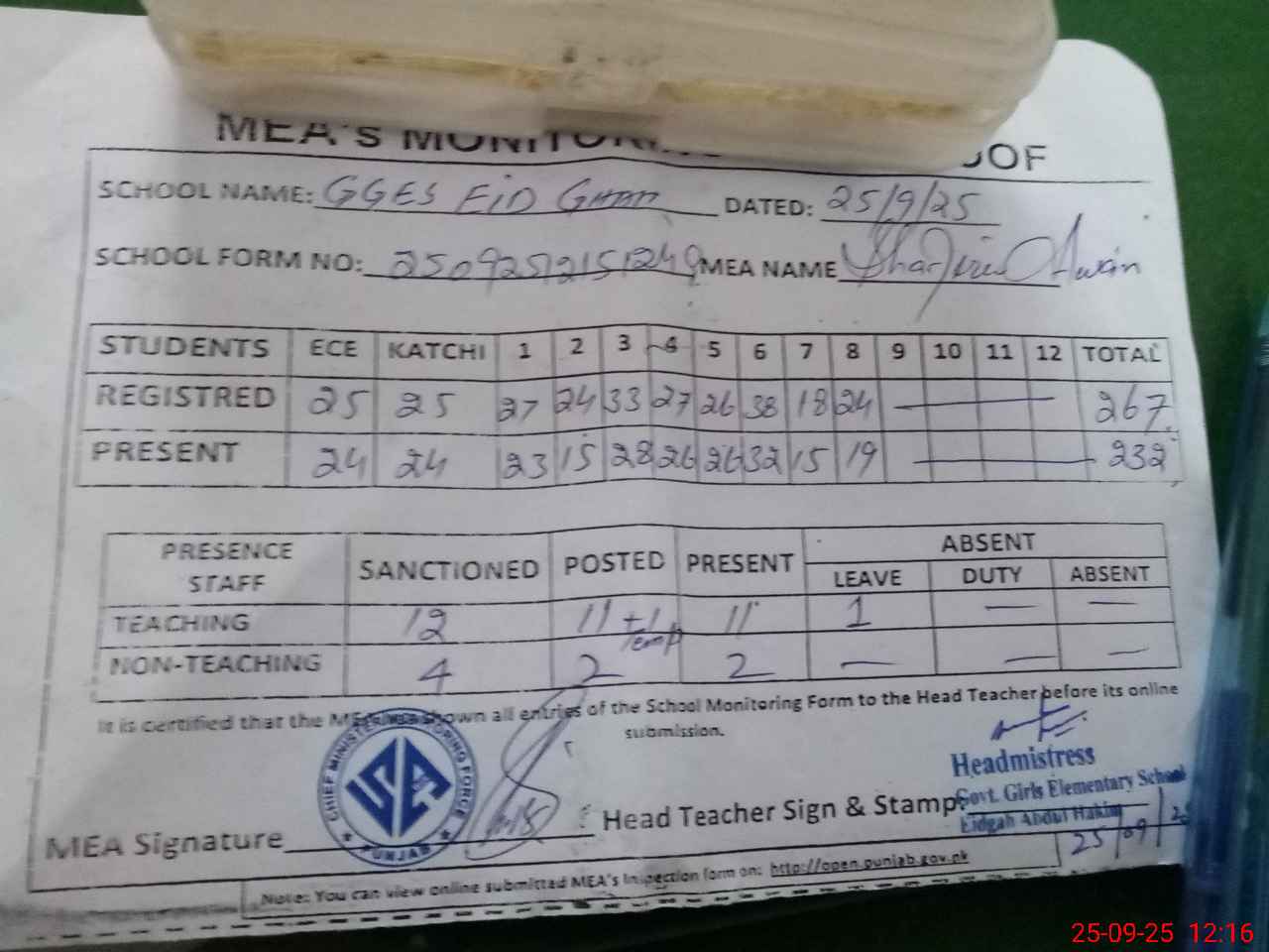 | Attendance Register | Head Teacher | MEA with School | Visit Proof |