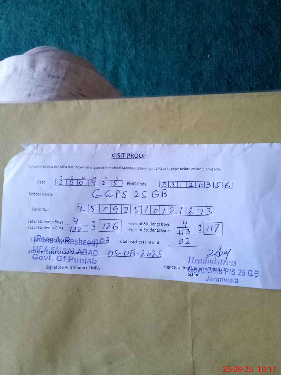 | EMIS Code: 33120356 | Name of School: GGPS CHAK 25 GB JARANWALA | |||