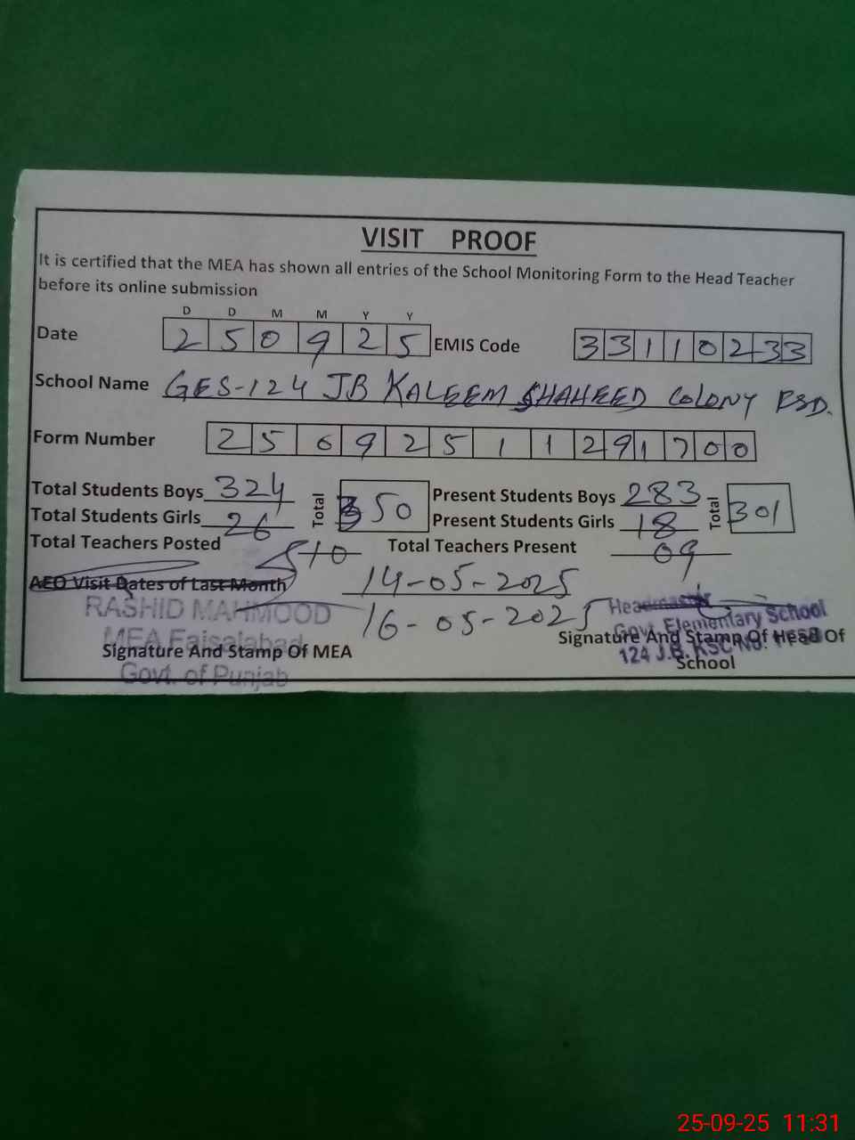 | EMIS Code: 33110233 | Name of School: GES 124 JB KALEEM SHAHEED COLONY 1 FSD | |||